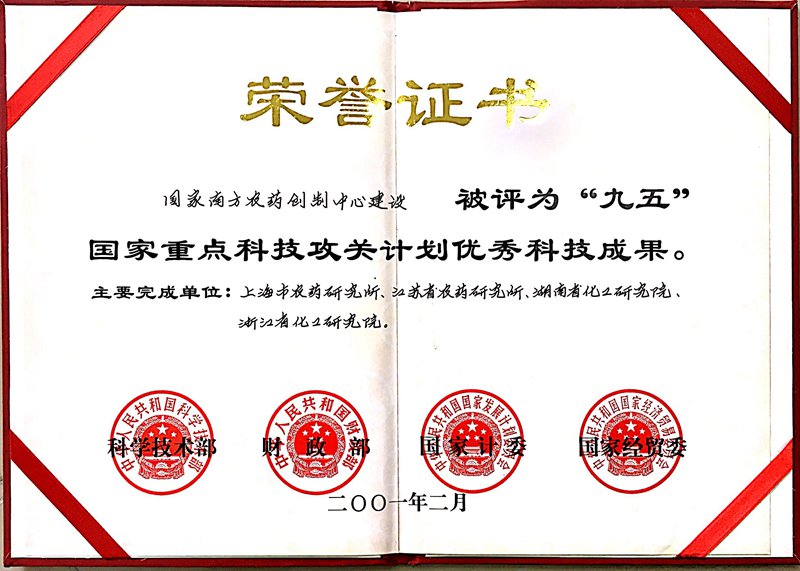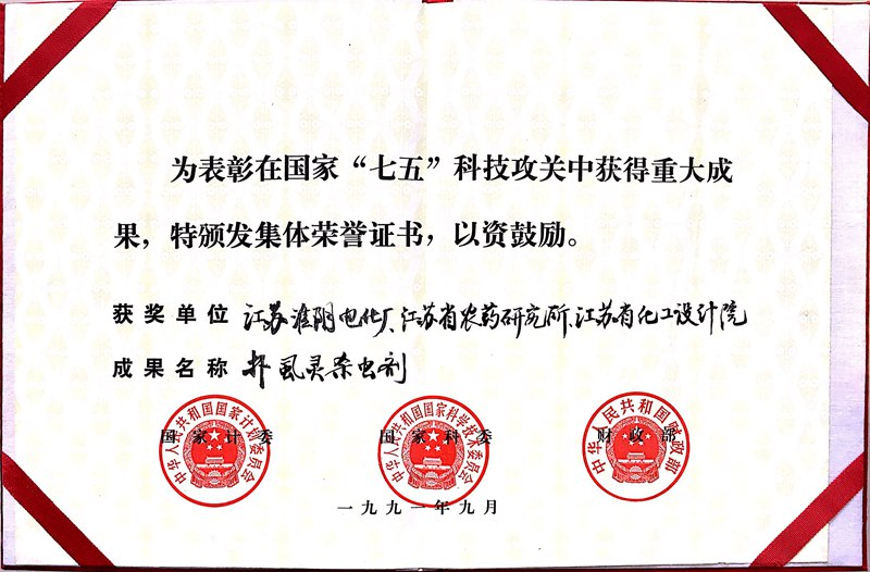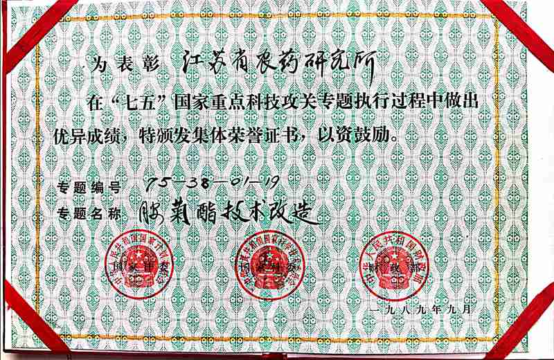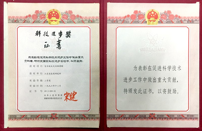 1996.12“富右反式丙烯菊酯”榮獲“國(guó)家科技進(jìn)步獎(jiǎng)”