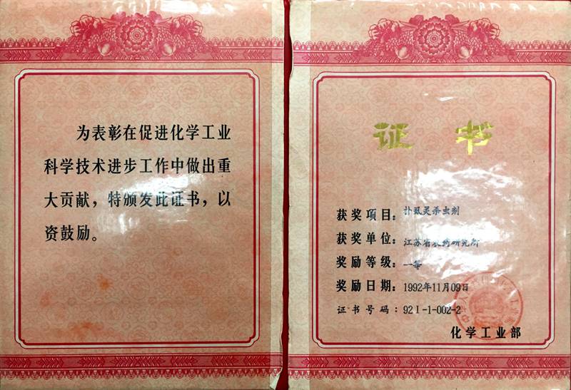 1992.11化工部“撲蟲(chóng)靈殺蟲(chóng)劑”一等獎(jiǎng)