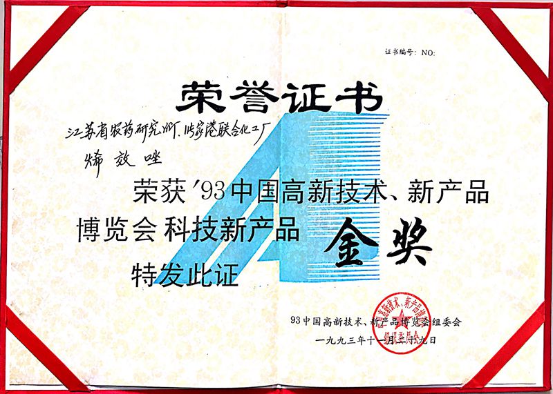 1993.“烯效唑”獲得“中國(guó)高新技術(shù)博覽會(huì)科技新產(chǎn)品”金獎(jiǎng)