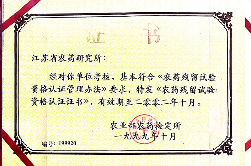 1999.農(nóng)藥鑒定所頒發(fā)《農(nóng)藥殘留試驗(yàn)資格認(rèn)證書(shū)》