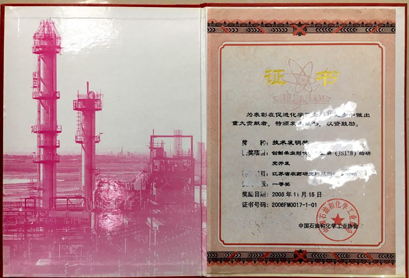 2006.11“呋喃蟲(chóng)酰肼”榮獲國(guó)家工業(yè)協(xié)會(huì)“技術(shù)發(fā)明獎(jiǎng)”一等獎(jiǎng)