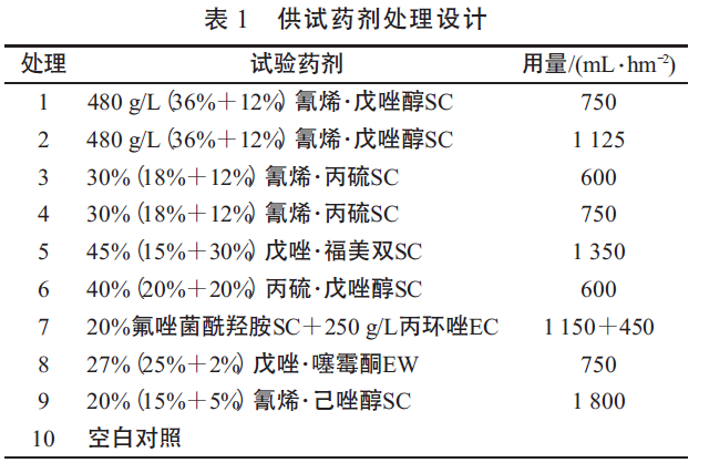 施藥器械為英達電動噴霧器3WBD-20型,工作壓力為0.15~0.40Pa,噴液量為450kg/hm2,噴霧均勻,試驗期間未使用其他殺菌劑。