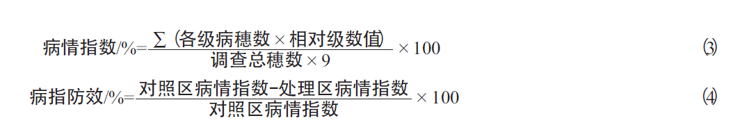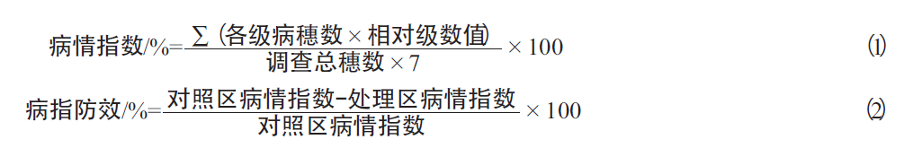 于病情穩定期(2020年5月28日)調查各小區發病情況。每小區對角線五點取樣,每點調查相連1000穗,計5000穗。以發病小穗占全穗的百分率來分級,記錄各級病穗數,分級標準以及數據處理方法參照農業部農藥檢定所編寫的《農藥田間藥效試驗準則》,按式(1)、(2)計算病情指數和病指防效。分級標準為0級:全穗無病;1級:感病穗面積占全穗面積的1/4以下;3級:感病穗面積占全穗面積的1/4~1/2;5級:感病穗面積占全穗面積的1/2~3/4;7級:感病穗面積占全穗面積的3/4以上。