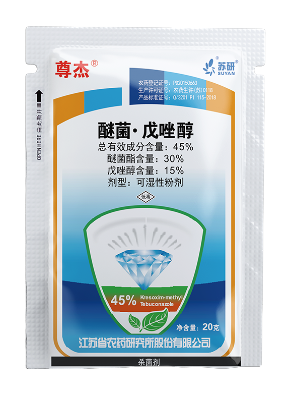 本品為戊唑醇和醚菌酯的新型復配殺菌劑,戊唑醇是甾醇脫甲基抑制劑,醚菌酯屬線粒體呼吸抑制劑,混配后對蘋果褐斑病等病害有較好的防效。